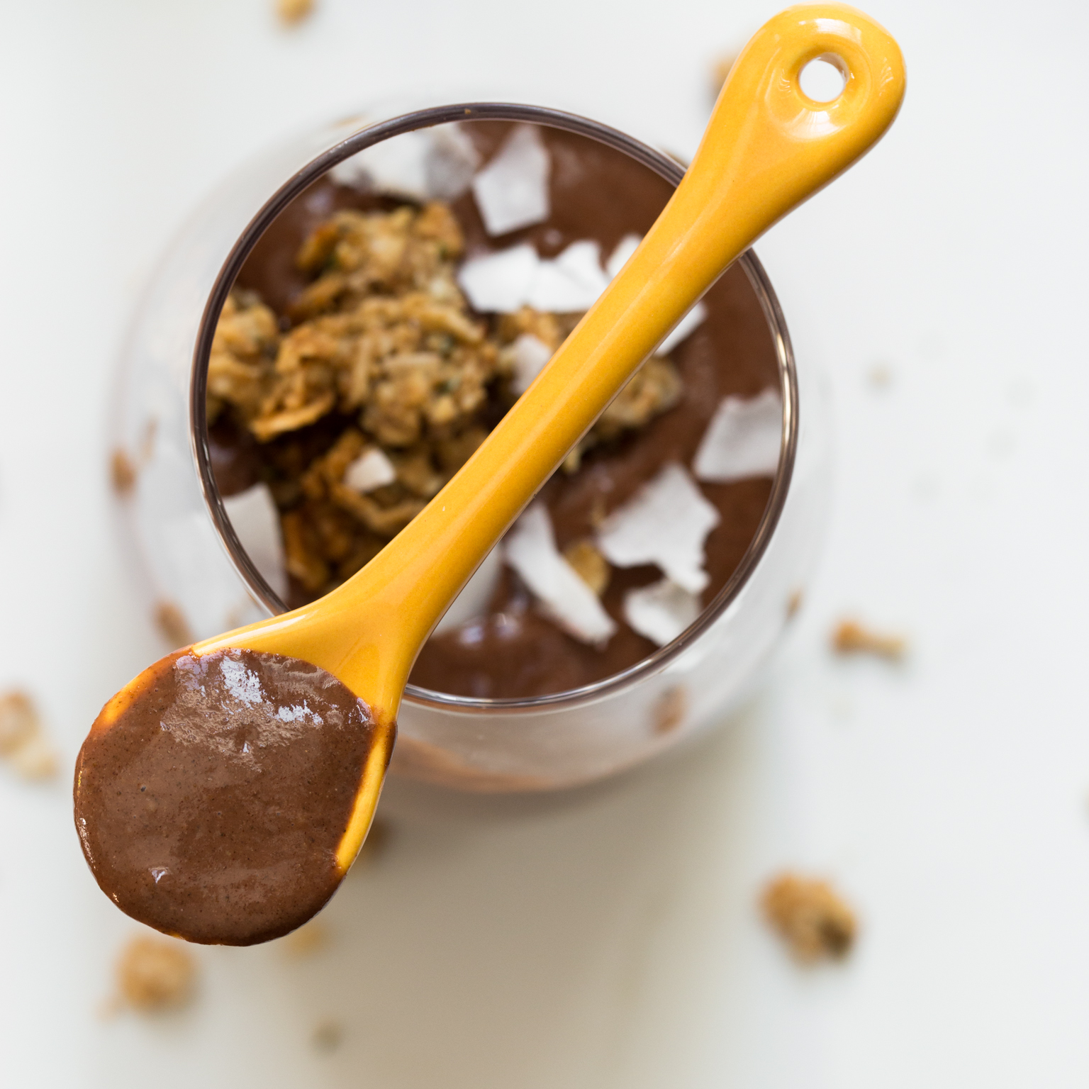 To energize myself during the endless packing sessions I threw together this chocolate chia pudding. Ok, ok, I made it 4 times in the span of 6 days. I love this stuff. It only requires a few ingredients and it satisfies all those creamy chocolate cravings in a healthy way sweetened only with dates. This pudding reminds me of chocolate cake batter – creamy, chocolaty, with a hint of vanilla. Not only is it tasty, but it’s packed with over 10 grams of fibre and 7 grams of protein per serving, as well as loads of iron, calcium, and omega-3 fatty acids. Now we’re talking!